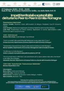 Il Clust-ER Economia Urbana ha partecipato all’evento “Impatti territoriali e sostenibilità del turismo Peer-to-Peer in Emilia-Romagna”, svoltosi il 27 febbraio 2026 presso il Dipartimento di Scienze Statistiche dell’Università di Bologna.